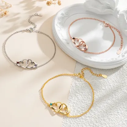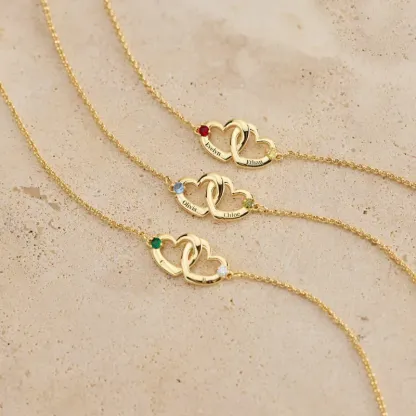 This exquisite Custom Heart Name Bracelet features a unique design with two interlocking heart pendants, symbolizing an unbreakable bond of love and connection. You can personalize the heart charms with engraved names and embed birthstones representing meaningful months. It is the perfect personalized gift for a loved one, mother, sister, or best friend.
