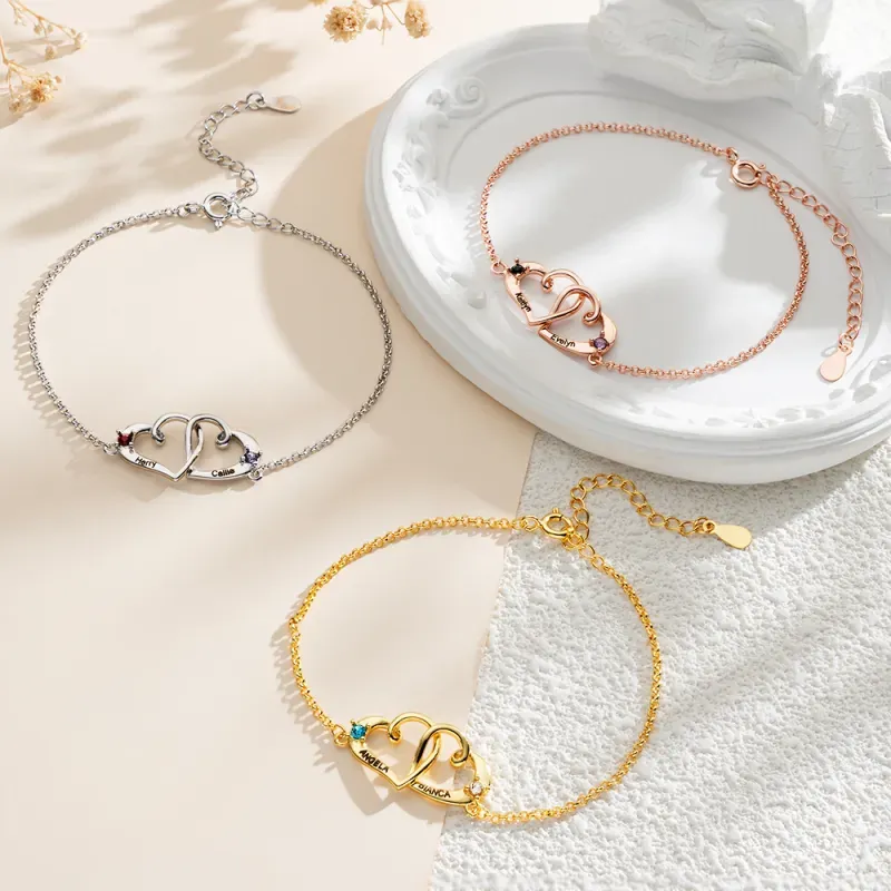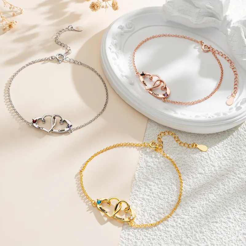 Custom Interlocking Heart Name Bracelet Birthstone Engraved Names Personalized Double Heart Bracelet for Couples Valentines Gift